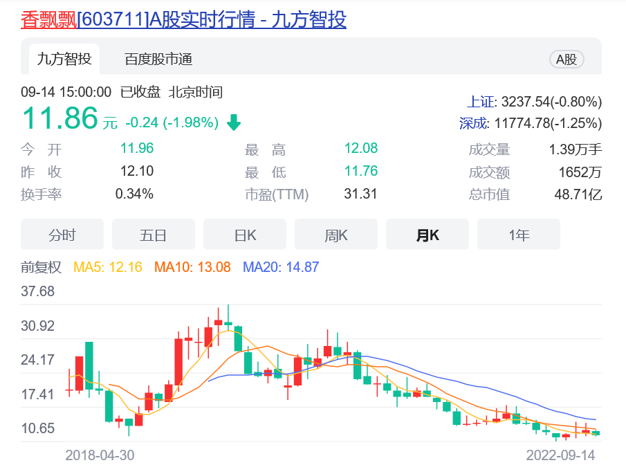 香飘飘的股价也是不断落落落落,截止9月14日收盘,香飘飘每股11.86元,低于5年前的发行价,总市值为48.71亿元,较巅峰时期蒸发了100多亿元。