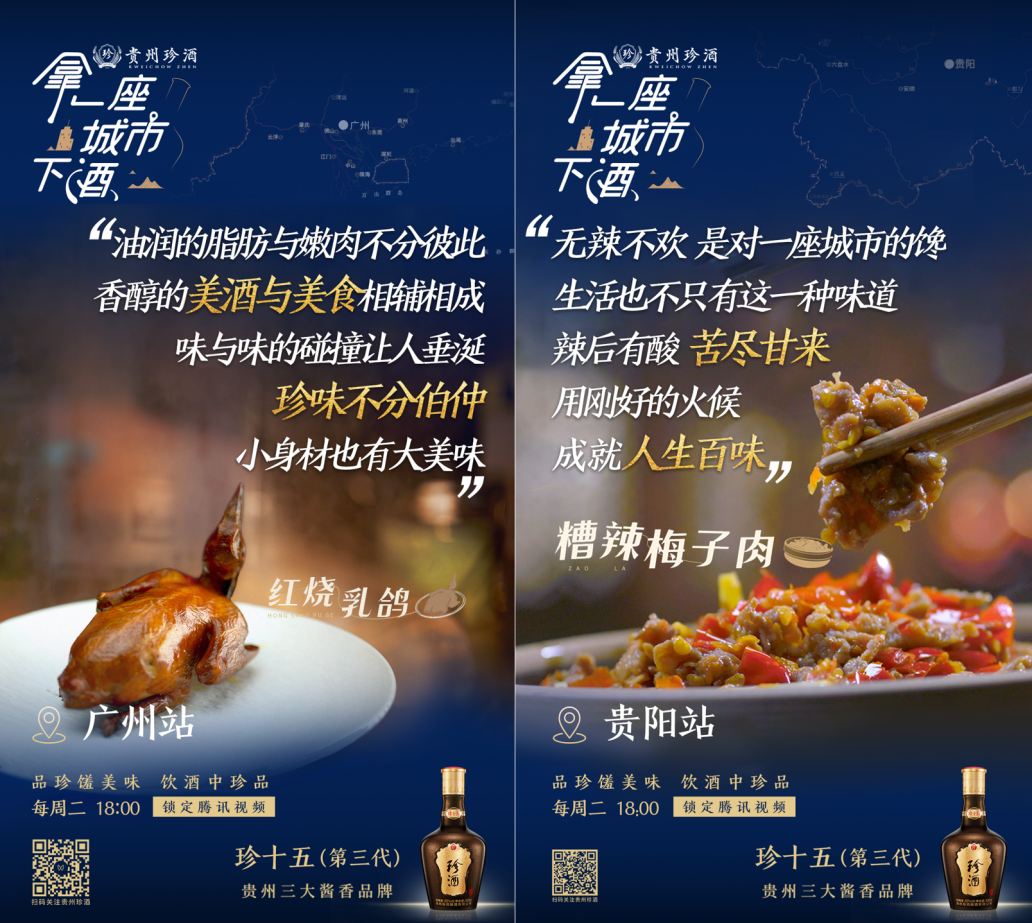 线上方面,贵州珍酒根据纪录片中8座城市美食打造城市创意海报,整合原生内容进行二次传播,以当地特色美食和人生滋味金句,唤起城市居民的共鸣与自豪感,将城市、美食、美酒、品牌与人连接在一起,全面覆盖用户心智。