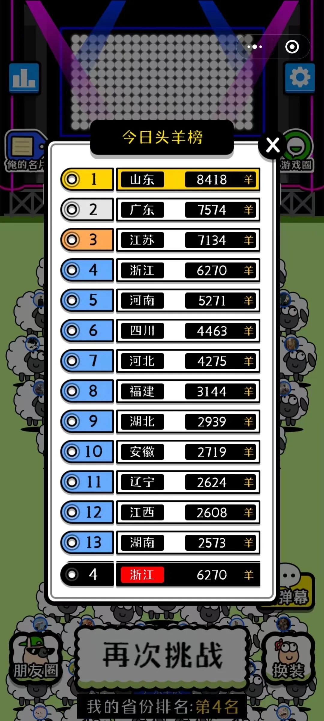 不得不说,在心理设计上,羊了个羊确实还是更胜一筹。通过简单关卡让人放松警惕,然后第二关直接难度拉满,以通过率不到1%的设计,让人在遭受“挫折”后又萌生出一种不甘的斗争心,确实比逐级递进的3tiles要来的刺激。同时,还设置了省份竞争排行榜,直接把挑战欲望拉满。