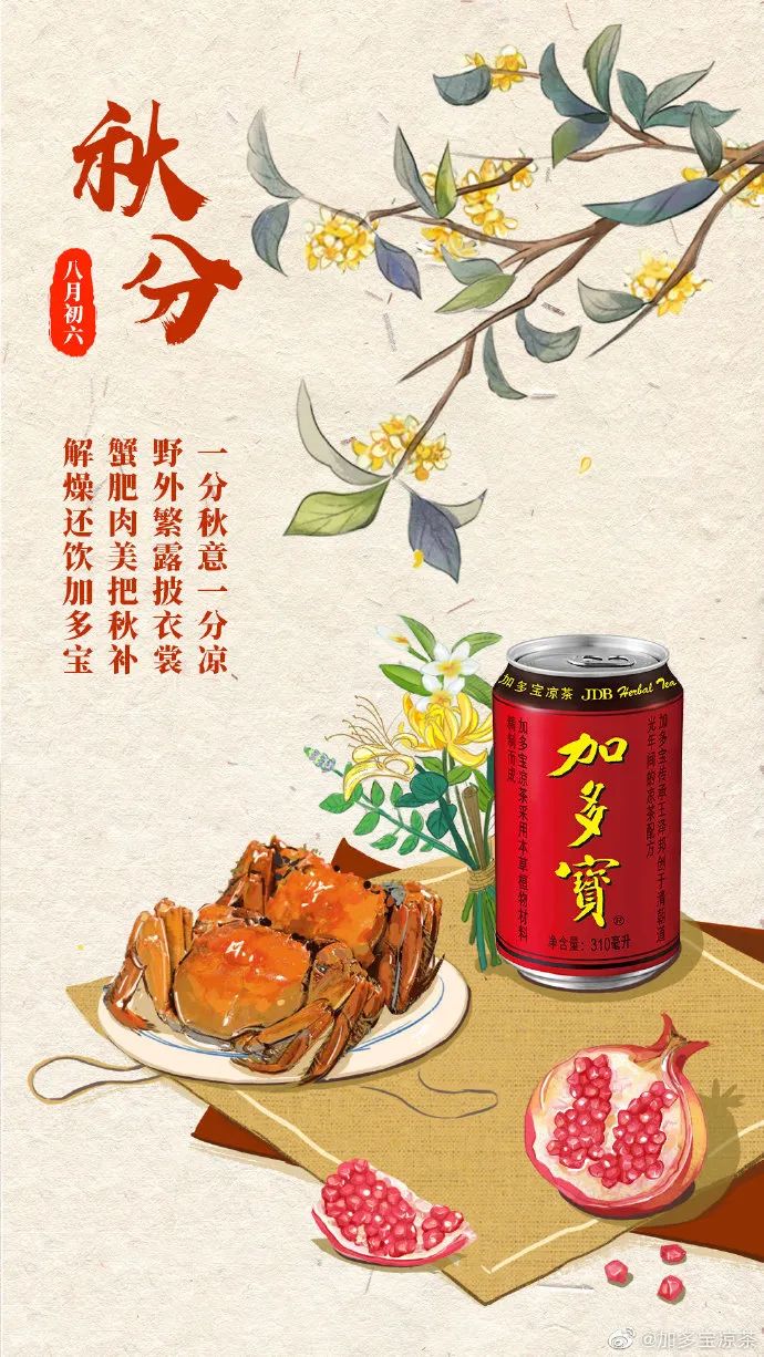 #秋分#秋风起,丹桂香,蟹脚痒,吃秋菜,作为节气中“二分二至”之一的秋分有着丰富的民间习俗,同时也是养生的好时节,在饮食上讲究解体渴、补气津、防上火。秋分赏桂品蟹之时,多喝加多宝凉茶,缓解凉燥、减轻“秋乏”、预防上火,方能心神恬适,享受人间好时节。