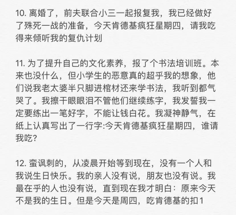 还有一种情绪营销,抓住大家“吃瓜”或者“听故事”的情绪。内容前面是百态人生,最终都是一个出其不意的转折,落脚到一个地方,让人觉得好笑、有趣,激发传播欲甚至创作欲。最经典的莫过于肯德基的“疯四”文学。