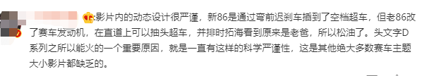 黑马选手是拓海的父亲,而他的座驾是本广告的主角GR86。可以看到,虽然只是广告片,但是制作的用心程度丝毫不输原片。倾泻而出的爆燃音乐和引擎,还有拓海一如既往的从容过弯,都令观众肾上腺素飙升。除此之外,其剧情细节也得到网友好评。由此可见,广告致敬经典的时候,最重要的就是深度还原,否则会因为“毁经典”招致观众反感。加之跑车的目标客群是“技术控”,任何性能方面的瑕疵,都会直接败好感。