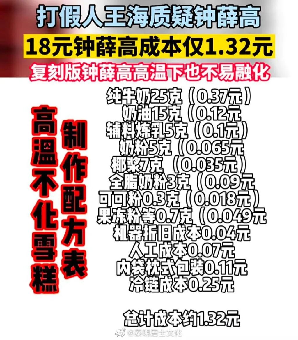 看回王海打假那些事,手撕钟薛高、拳打罗永浩、脚踢辛巴,一个个都是网红级别的大人物和品牌,不知道的以为王海以“职业打假”之名,干着“职业碰瓷”的事。2020年,网友爆料在辛巴直播间卖的燕窝是糖水,虽然辛巴一开始否认,但王海后续发布检测报告,验证辛巴燕窝是风味饮料不是燕窝,还表示产品工业成本不超过1块钱。再把时间拉到今年7月,#18元钟薛高成本仅1.32元#上了热搜,这个话题同样少不了王海的助攻。当时王海发布复刻钟薛高视频,内容就是根据钟薛高的原版配方,逆向制作出一款与钟薛高同样高温不融化的雪糕。只为告诉大家一个事实:售价18元一根的钟薛高,成本仅不到2块。要知道在那段时间,钟薛高可是舆论的焦点,“室温下放置1小时不化”才下热搜,“用打火机烧不化”又被热议。尽管有部分质疑王海的成本计算方式欠妥,但热搜也变相传递一个信息:不好好做雪糕的钟薛高,把成本都费用都花在营销上。如今王海打假疯狂小杨哥是否为了碰瓷,大家看法各有不同。但作为打假斗士,王海自称吹哨人和清道夫。根据亿邦动力的专访显示,王海接受消费者委托索赔,安排律师代理赔偿五五分成,无效果不收费。举个例子,假设一共1000位消费者的话,每人赔偿2万,王海方可以拿到1000万。