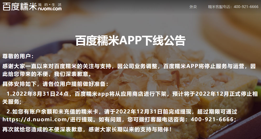 日前,百度糯米宣布将于2022年12月正式停止相关服务,APP也于8月底正式从应用商城下架。作为百度曾经的战略中心,百度糯米承载着其在O2O领域的野望。李彦宏甚至不惜喊出“砸200亿也要把它做好”的决心,但这一切,从百度转身,All in AI的那一刻开始,便土崩瓦解。5年之后,曾经的团购三巨头之一,百度糯米彻底迎来了自己命运的终结。消息传出是在9月20号,百度糯米APP停运的公告很快冲上了微博热搜。作为曾受一代人追捧的团购巨头,糯米的停运引得无数人唏嘘,“当年糯米3.7活动,花了三个三块七,又有酒,又有零食果盘,唱k唱了一宿,真怀念啊”。也有网友看到新闻才发现,“自己好像很久没有用它了”。而对于一些年龄比较小的网友,或许还未曾听闻百度糯米之名,它便已经死亡。毕竟,时代已经不需要它了。事实上,百度糯米的死亡并不在此刻,如今的停运公告反而更像是一场对糯米命运的收束。而糯米的生命,早在2017年便被终结。刚刚从千团大战中杀出的糯米,被行业老大老二(美团、大众点评)的联姻打得措手不及;内部的腐败乱象也在百度的反腐风暴中浮出水面,在这场风波中,百度糯米负责人曾良被解聘。内外交困下,前一秒还光鲜亮丽的糯米,下一秒便风雨飘摇。而随着2017年李彦宏的“拨乱反正”,百度糯米、百度外卖等O2O项目彻底成为弃子,被扫地出门。再之后,便是江湖上时有传出的“百度出售糯米”传闻,这一等,便是5年,只是始终没能等来接盘人。5年间,百度糯米逐渐依靠广告服务来苟延残喘,但也不过是勉强续命,中国O2O舞台上,再也没有了它的名字。如今,随着平台商户数量彻底归零。死亡5年的百度糯米,到了被盖棺埋葬的时刻。有网友感慨,“那时候每周六有6.6的电影票,都是在糯米买的”,而如今,我们再买不到6块6的电影票和3块7的KTV套餐。生命最后的喧嚣落幕,再后来,或许人们也只能从互联网上寻找它存在过的痕迹。百度糯米的辉煌,始于10年前那个团购平台兴起的盛世。2008年,美国出现了一家名为Groupon的初创公司。它的业务模式很简单,每一天,Groupon都会发起一个拼单,感兴趣的消费者可以共同参与购买本地商家的优惠券,这个优惠券的价格普遍要比正常消费便宜2-3成。如今看来这个颇为原始的团购模式,在当时,却是一项开创性消费模式,备受市场关注。借此,Groupon也超越Facebook和Google,成为彼时全球成长最快的互联网公司,没有之一。Groupon并非团购模式的开创者,但却启发了后来的一众互联网公司。其中,就包括中国的第一家团购网站——美团。2010年3月,美团正式成立,团购模式开始在国内开花。3个月后,糯米网诞生,那时它还在人人公司旗下,日子过的虽顺风顺水,但也并不算宽裕。从各种实物商品到线下服务,但凡能够花钱的地方,几乎都有团购平台的身影。短短一年时间,全国上下喷涌而出5000多家团购网站。千团大战的打法也很简单,和后来的无数次资本厮杀同样,烧钱、烧钱、再烧钱。烧到最后,仍站在战场上的只剩下三家,背靠阿里的美团、背靠腾讯的大众点评和背靠人人的糯米网。这个时候,战争并未结束。小玩家出局后,最后的三雄到了决生死的时刻。也正是在这时,糯米于2014年被百度收购,钱包一下子鼓了起来,有了与美团、点评相搏的底气。并在2015年,百度糯米单日流水突破3.5亿元,较前一年翻了15倍。彼时的李彦宏,对O2O市场志在必得,扬言“砸200亿也要把它做好”。只可惜,世事无常,糯米非但没能等来与美团、点评公平对决的机会,反而听到了美团背叛阿里,投奔腾讯的噩耗。在腾讯的撮合下,美团、点评合并,独占8成市场份额,成为千团大战的最后赢家。百度则受内部反腐风暴和魏则西事件的舆论影响,自顾不暇,糯米走到悬崖边上。2017年,百度宣布All in AI,糯米彻底被抛弃在时代之丘。糯米的死亡,正式给百度曾经的O2O战略画上了一个句号。但这并不意味着,百度要彻底退出本地生活板块。相反,无论是百度APP、百度地图等,都在越来越多与本地生活服务挂钩。在百度APP“惠生活”板块,有美食外卖、百度影票等各种生活服务;在百度地图,也可进行预定酒店、打车等操作。在百度转型之后,美团以团购、外卖为基石,牢牢占据着行业头部位置,失去了美团的阿里,则围绕饿了么开始发力。时至今日,整个O2O赛道,也仍是美团、阿里系的舞台。庞大的市场给了美团足够的发展机会,2020年5月,美团市值正式突破千亿美元大关,甚至超越了百度,成为继阿里和腾讯之后,中国第三家破千亿美元市值的互联网公司。2012年,快手正式转型成为短视频社区,并在3年后迎来市场。2016年,字节跳动上线了一款名叫“抖音”的产品,并开始推广。2017年春节,一鸣惊人。移动互联网时代,短视频成为新的王者。而在王者遭遇增长瓶颈的今天,“本地生活”成为新的破局点。尤其是疫情期间,无论是9.9元的羊肉串,还是各地景点优惠套餐,都疯狂涌入抖音、快手,短视频平台的本地生活业务开始沸腾。只不过在经历了数次的烧钱厮杀,资本也终于冷静下来,整个行业开始追求精细化运营。资本口袋里为数不多的钱,也更加慎重的投在能够赚钱的领域。在短视频巨头于2017年崛起之时,正是百度糯米迎来死亡的时刻。时代浪潮里,谁都可能成为明日被抛弃的棋子。而当我们如今在缅怀百度糯米时,或许更多的是在怀念曾经那段时光。糯米的落寞,不过一场初代团购巨头之