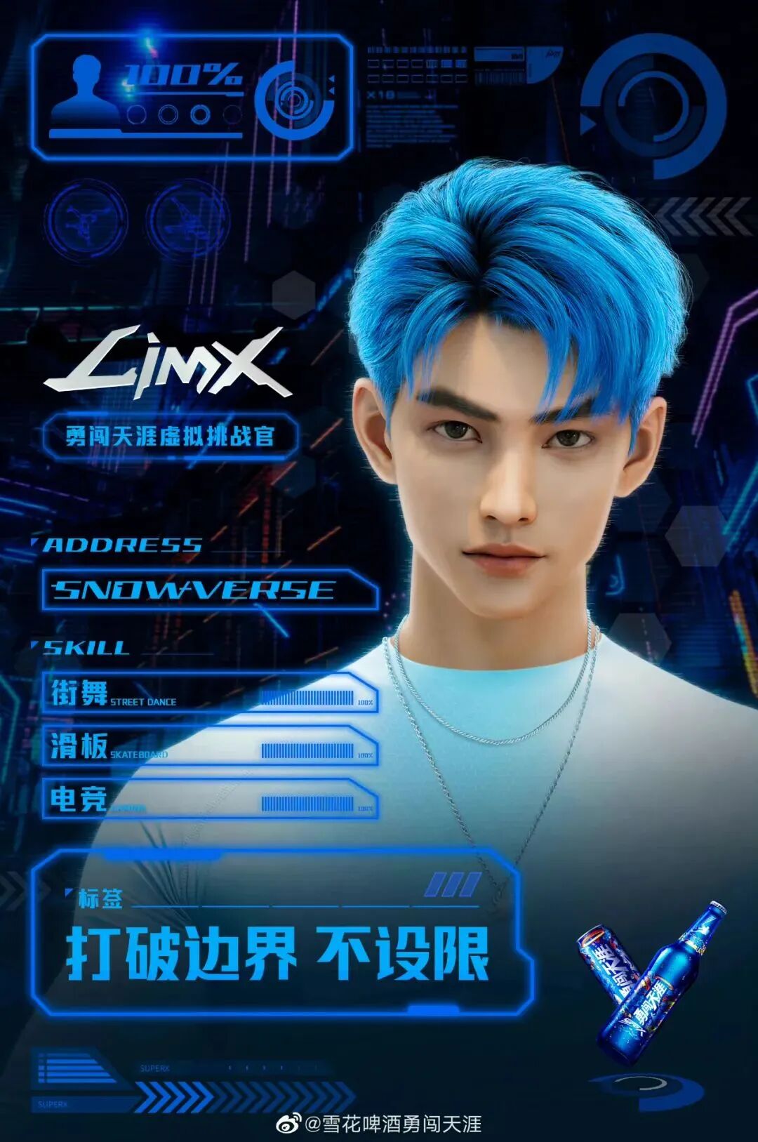 人格层面,“LimX”承载了勇闯天涯“挑战极限”这一经市场认可和喜爱的品牌基因,名字也并非原生单词,而是打破“Limit边界”,加之代表着无限与未来的“X”组建而成,与“挑战极限”的品牌基因相互呼应;此外,雪花啤酒前期走心开展了Z世代调研走访,基于对年轻群体的精准洞察为其设定口头禅、爱好与习惯,比如“LimX”就具备街舞、滑板等时下年轻群体热爱的运动技能,打造出具备先锋精神的虚拟斜杠青年。