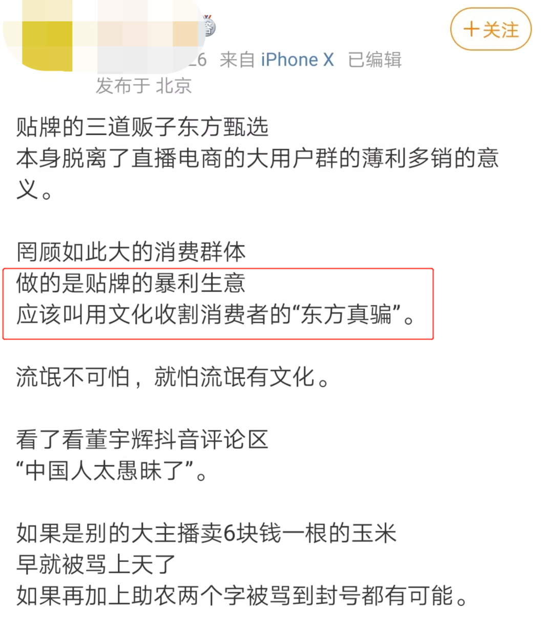 对于董宇辉的回应,辛巴并没有接招,反而在直播间低头道歉,表示自己被对某音平台的仇恨蒙蔽双眼,说了很多不恰当的话。本来随着辛巴道歉,双方争论逐渐偃旗息鼓,但半路杀出了个程咬金。最近,吉林省东北农嫂食品公司高调宣布,自己是东方甄选所售玉米的供应商,而且东方甄选直播间卖6元/根,自己仅卖3.6元/根。这个价格,正好和辛巴所说的40%利润对照上了。消息一出,舆论哗然。有网友指责东方甄选是牟取暴利的“三道贩子”,做的是贴牌的暴利生意,是用文化收割消费者的“东方真骗”、“东方黑选”。