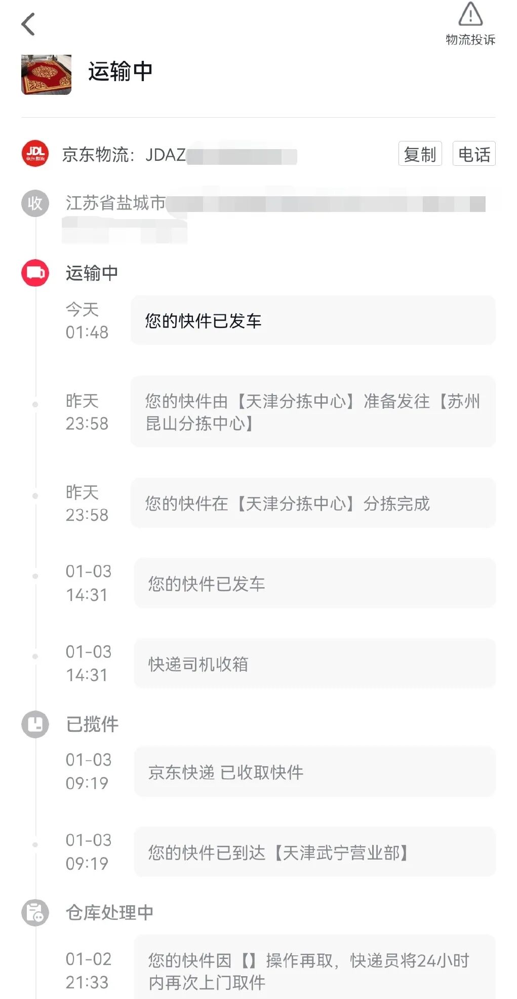 但有商家吐槽,“在抖音上用京东物流发货,距离是从天津到江苏,6天过去了买家还没有收到。”