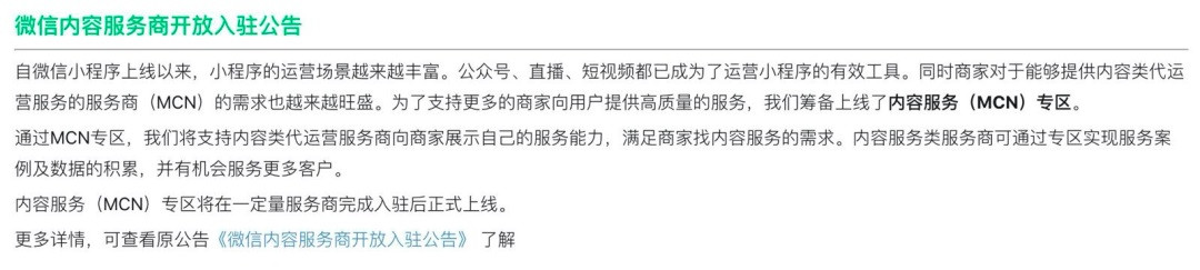 微信近日发布《微信内容服务商开放入驻公告》,该公告介绍,微信筹备上线了内容服务(MCN)专区,该专区支持内容类代运营服务。