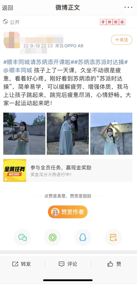 更关键的是,顺丰同城也在这个基础上设置了不少巧妙的“传播杠杆”。在积极分享生活的社交平台微博上,顺丰同城主动发起话题#顺丰同城请苏炳添开课#,#苏炳添苏派时达操#,为积极互动的网友们送出了“苏派时达操手册”、“苏神签名照”等奖品。而在顺丰同城发起的“跟着苏神一起跳苏派时达操”星选任务中,品牌更是给跟跳并分享的网友们送上了万元大奖,短短几天就吸引了1955人自发参与投稿,掀起了一股跳操的风潮。