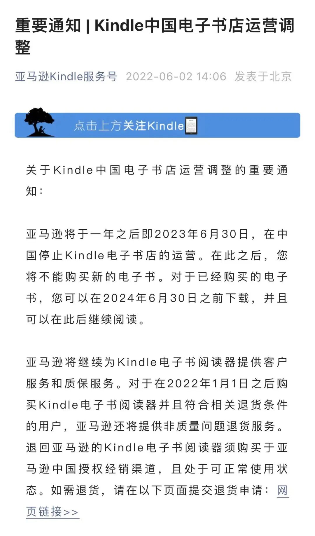 就在3个月前,6月2日,亚马逊发布公告表示,将于一年之后的2023年6月30日,在中国停止Kindle电子书店的运营。在此之后,用户将不能购买新的电子书,已经购买的电子书可以在2024年6月30日之前下载并持续阅读。
