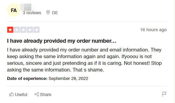 不过细看,一开始回复好评官方还会变花样,最近的回复不仅速度跟不上,内容也真的官方。甚至对于同一位顾客两次不同内容的投诉,回复语句、标点符号都一样。是强调还是敷衍,不得而知,至少在这位德国消费者的回复中可见,他已经按照官方指示上传了订单号,但官方只会一遍又一遍重复同样的话,他对“不真诚的”If Yooou有点失望。