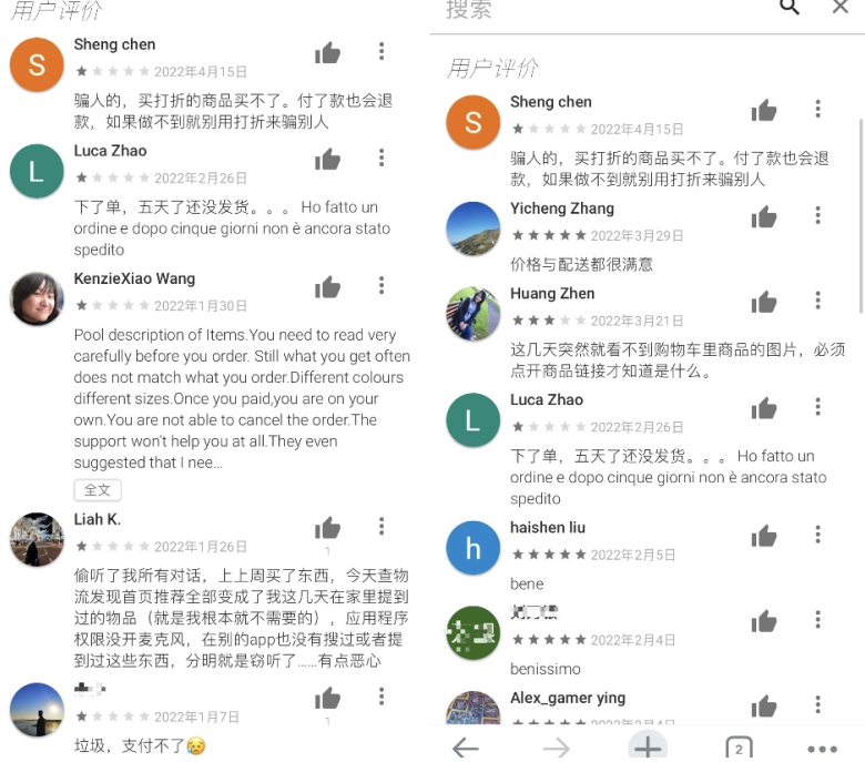 以Fanno为例,其主要采用小包直发(无库存)和海外库存两种模式,海外库存则是来自国内成熟大卖家。要想保证速度,海外建仓的大卖自然是优选,相反如此一来限制也会很大。从app的用户评价上看,大多网友对物流颇有微词,也有网友吐槽,“没有找到搜索栏,图片显示不出来”,这也侧面体现Fanno界面缺少合理规划,折扣标识混乱,产品图也不清晰。