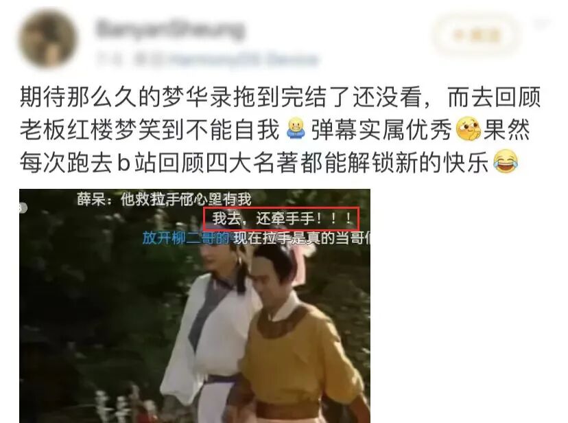 上线多年的四大名著,为什么能够在弹幕这块焕发“一春又一春”?一个重要的前提是:一部剧的弹幕丰富与否,跟观众对剧作的熟悉程度有关。弹幕越丰富,说明观众对剧情越有讨论欲望,也说明这部剧本身就已经足够经典、出色。以四大名著为代表的剧集作品,本身足够经典,吸引观众无数。所以它们更适合在茶余饭后作为“电子榨菜”,成为一种谈资式的存在。此时,情节不只是电视剧连贯上下文的有机部分,也是让人们逗乐、共情、谈论的社交工具。反观现在的“新剧出圈”,倒还是会被人拿出讨论、登上热搜。但也有越来越多人表示:自己是在“微博上追完的”“在抖音上刷完的”,反正不是好好看完的。对比之下,更激发了观众们自发对老剧进行“社交式改造”的欲望——它可以演变成梗图,可以做表情包,只要你一说,就一定有人能懂。从最开始的“弹幕影响观感”,到后来的“这玩意挺有趣”,再到之后的“没弹幕不行”“我甚至可以在脑海自动弹幕”……不止四大名著,还有《铁齿铜牙纪晓岚》《神探狄仁杰》《雍正王朝》等等。在那些经典作品中,你总能看到“弹幕侠”们活跃的身影。只不过,四大名著中播出最早的《西游记》已经是36年前的事了。其他的,《红楼梦》是35年前,《三国演义》是28年前,《水浒传》是24年前,连大家经常玩梗的《甄嬛传》,距播出也已有11年……回头想一想,连带那些结伴守在电视前等看剧的时光,好像是那样的久远。