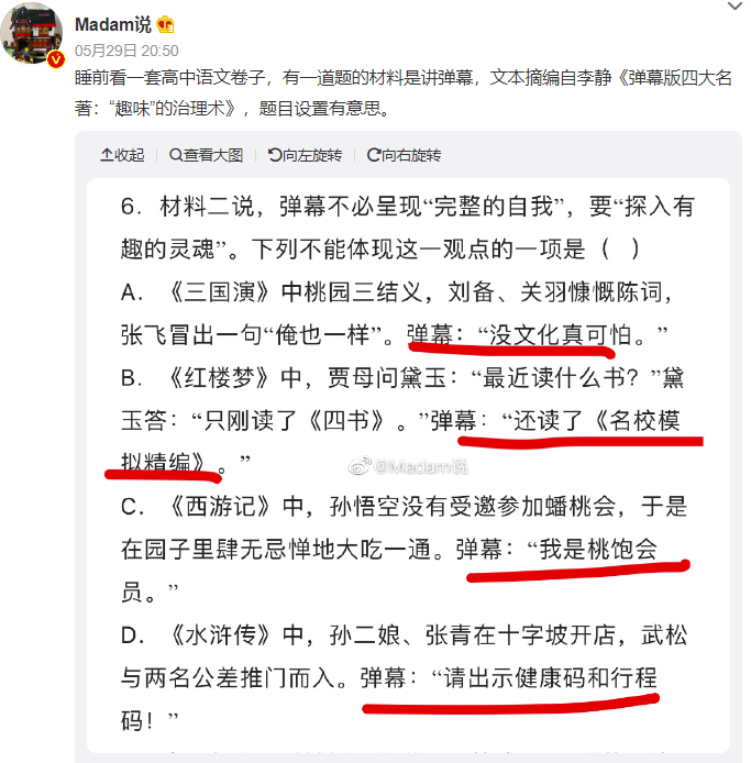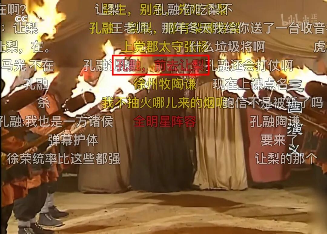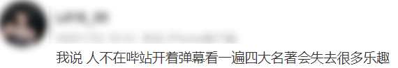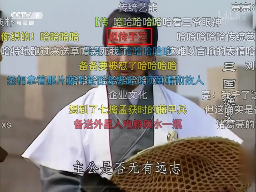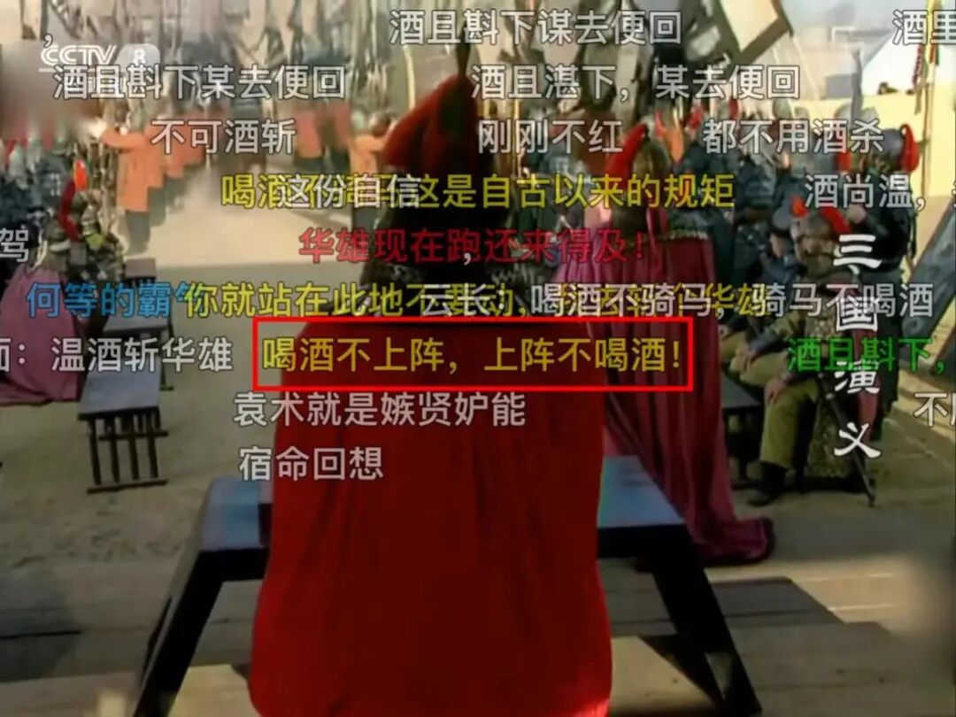 要论弹幕精彩程度,四大名著中,老少咸宜的《西游记》最有发言权。剧里取经之路漫漫,剧外观众也没闲着,打从一开始,创作欲望就拦不住了。回看那一幕,石猴刚出世,过五关斩六将,才被众猴拥簇为大王,正商量叫什么封号。有一只老猴说:大王心性灵清,形容俊美。经典名场面“大闹天宫”,曾经削骨还父、削肉还母,最终靠莲藕重塑真身的哪吒与孙悟空对战——到了唐僧受李世民之命,前往西天取经,李世民为表诚意,给“御弟”唐僧备了一个紫金钵盂。又是一次,银角大王捉住了猪八戒,金角说这不是唐僧,吃了没用。唐僧被红孩儿捉住那一段,孙悟空与猪八戒一同去捉拿妖怪,但没想到惹来三昧真火烧身。红孩儿哈哈狂笑,弹幕一点儿也不同情猪猴二人:这不就好一出烽火戏猪猴。该说不说,虽然有人感觉“弹幕=闲扯”,但很多时候,里面的内容却都能和现实联系在一起。唐僧被蜘蛛精捉住,一群小蜘蛛精拉着他到处跑来跑去。果然,“弹幕强人”们的话诚不我欺:看剧是一回事,打开弹幕看剧,又是另一回事。《西游记》“传艺玉华州”一集,当地驱逐和尚,孙悟空于是将猪八戒卷在凉席内躲藏。可怜的八戒被卷在席子里,哼哼唧唧,难受不已;那边弹幕却在线整活儿:由于观众老爷们太善于从剧情中抽梗,加以时不时抖机灵,《西游记》也成了大家心目中的“搞笑弹幕第一名”。央视四大名著电视剧中的每一部,都称得上弹幕大户,其中《三国演义》,更是一度霸占了b站弹幕数量第一。刘关张桃园三结义,那一集,他们在集市上不打不相识。关羽关二爷将富人的钱撒出,劫富济贫,弹幕立刻说道:曹操给关羽温酒斩华雄时,关羽并没有喝下热酒,而是说:酒且放下,我去去就来,说罢飞身上马。弹幕也笑了:孔融,前去让梨(不管怎么说,单押skr)。看得出来,如果看《西游记》需要想象力,那么《三国演义》则更考验大家博古通今的能力。比如,诸葛亮刚出山时,刘备看他日夜操劳,亲手编了一顶草帽相送。这时弹幕当然不能忘了cue下刘备的出身:有人形容:有时甚至觉得“四大名著”莫不是什么难兄难弟?红就一起红,被“玩坏”也谁都别落下,毕竟再看隔壁《红楼梦》也是同样热闹。刘姥姥第一次带着板儿去荣国府,板儿带着一顶红色的帽子,弹幕一看这打扮就笑了:还有凤姐向刘姥姥分享茄鲞做法那一段,当时听得刘姥姥一愣一愣的。说到这里,痴迷《水浒传》的朋友可能会着急:怎么我们一百单八将不配有姓名?对此只能说,“108位主角”引发的魔幻穿越,恐怕就能撑起弹幕界的大半江山。从“郭奉孝单臂擒方腊”到“浔阳楼悟空题反诗——齐天大圣到此一游”……第一次看到这场面的人会感到疑惑:不好意思,我是新来的,这块的画风一直是这样么?对于这个问题,在弹幕区“杀过七进七出”的人可能告诉你:习惯就好了。02