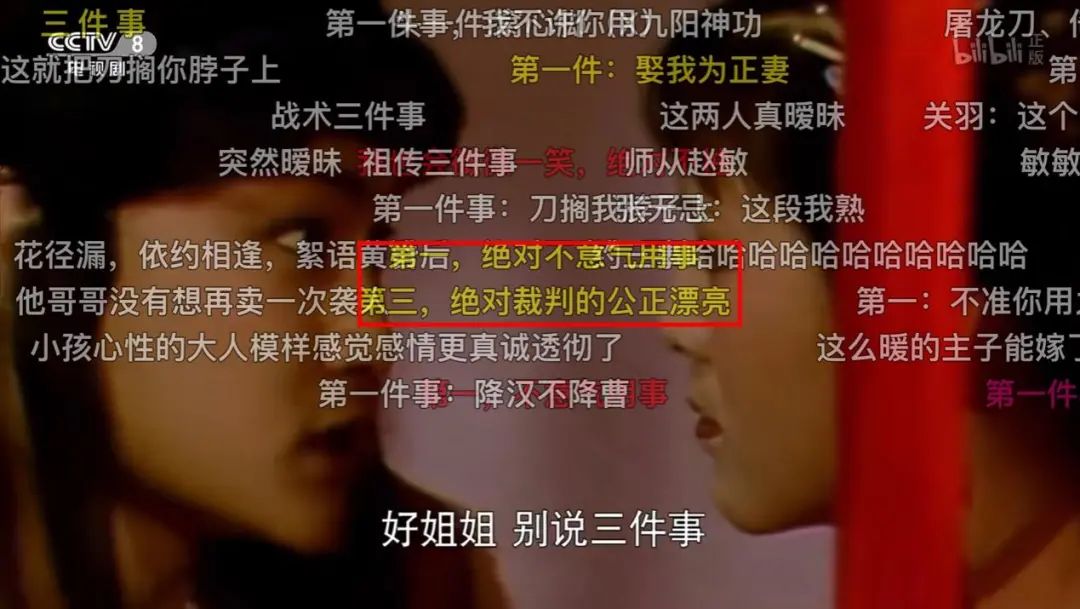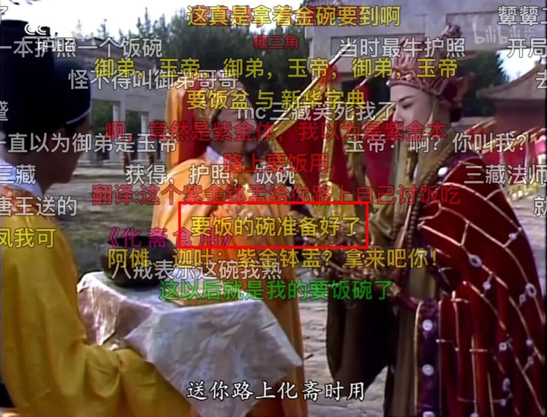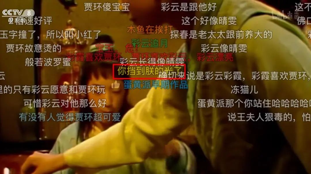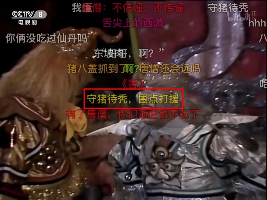 在弹幕的世界,如果你问:那么多人痴迷于弹幕,到底有什么意义呢?当复古潮流席卷互联网,以经典老剧下饭,已经是无数年轻人的基本操作。在难得的吃饭、休息时间,一边看喜欢的作品,一边看弹幕解压,岂不美哉。更别说在这个过程中,弹幕会溢出剧集本身,跟其他的影视作品,甚至历史文化,产生着奇妙的跨服联动。配合弹幕食用影视剧的过程,往往也就成了默契解码的过程。比如有一次,宝玉去袭人家看望,听到袭人要赎身的消息。宝玉暗自伤心,袭人趁此机会说:你若安心留我,再答应我三件事,就是刀搁在我脖子上,我也不回去了。贾环在王夫人屋里,罚抄金刚经。不一会,他把小丫鬟推到边上,说道:去,你把亮儿挡了,我怎么写字?见此情景,网友们又立刻联想起来齐妃名场面:你挡着朕的光了,朕怎么看书啊?总之,别看弹幕层层叠叠,云山雾绕,但就像网友们说的:只要你想。并且,还会有远方的声音与你交流呼应,哪怕是“猪猴联盟”和“你的名字”联结,都能有人一秒get你的笑点;《西游记》跟《甄嬛传》为什么会联系上,也有人能瞬间理解。当看到怀了孕的八戒开始体现一些糙汉柔情,甚至抹上了胭脂粉饼,到人家闺房床中坐着。在各种跨服联动的加持下,一方面,弹幕本身就是一出大戏;另一方面,就像老话所说的“人生难得一知己”和“我的梗,你能懂”的快乐太难得。更别说当观众在根据剧情进行弹幕创作的时候,许多剧情本身就足够“有梗”。也难怪观众们的创作激情永不停歇,专爱跟弹幕“死磕”了。03