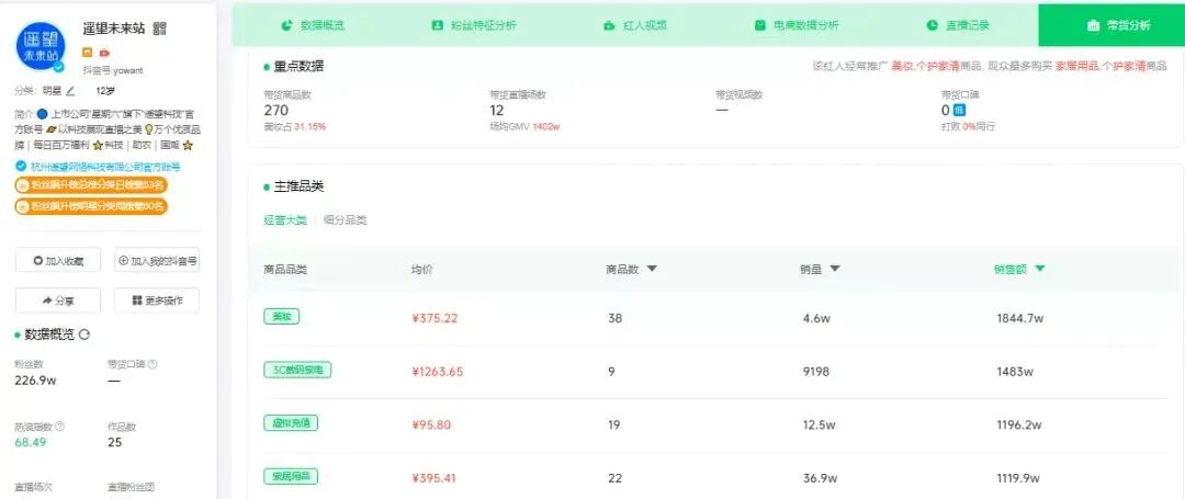 从带货商品来看,热浪数据显示美妆、3C数码家电、虚拟充值、家居用品这几大品类贡献了很大一部分业绩,这几大品类的销售额都在千万以上,其中美妆品类最为亮眼,在9月19日﹣9月25日这周的12场直播中,美妆品类上架了38款商品,销售额高达1844.7万,单周带货GMV1.68亿,位列带货榜第2名。