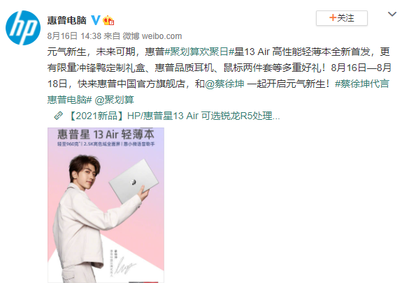 新时代年轻人熟悉互联网,善于接受互联网传播信息和分享信息,品牌发挥年轻人的社交传播力,打开轻传播玩法,无疑是高效实现营销传播的秘笈。惠普推出四个短片,在内容上具有极大的优势,但是如果将大众的视野吸引到 品牌营销上,引发对新品的推广,则需要发挥更多外在的传播力量。品牌选定代言人,是品牌打造长期影响力的玩法之一。借助代言人的粉丝流量,品牌会在粉丝应援中获得源源不断的话题讨乱和传播。惠普从最早选择蔡徐坤作为品牌代言人时就为长期的传播影响力埋下了伏笔,初期的热度就让代言相关话题获得了超过12.5亿的阅读量。此次惠普为蔡徐坤专门制作新品宣传海报,邀请粉丝们和蔡徐坤一起开启元气新生,进一步继承了此前的代言话题热度,为新品传播添砖加瓦。此外,惠普也与京东电脑数码展开深度合作。由京东电脑数码推出的“真新话大冒险”是一档进行新品开箱种草,硬核测评挑战的栏目,借助专业的测评,惠普为新品带动了种草效应。集合多为网络主播达人的电脑数码追新团对新品惠普星13 Air 轻薄本锐龙版的实机测评展示,用户可以从第三方视角态度真实的感受到产品质量,品牌也在这场梦幻联动中深度强化新品的“轻薄”属性,最终将产品引向销售端,为用户解锁新品。激活消费者的分享属性,在销售阶段也不失为产品传播种草的好时机。惠普通过晒单送鼠标、互动送好礼等重磅福利刺激消费者的分享欲望,为产品实现用户端的种草效果,从而完成整体传播链路的最后一环。惠普的整体传播玩法让品牌成功融入年轻群体,以年轻人喜好的方式引导他们实现对品牌源源不断的传播,而在传播过程中,惠普不断强化产品卖点优势,刺激用户的购物动机触点,最终实现销售转化。