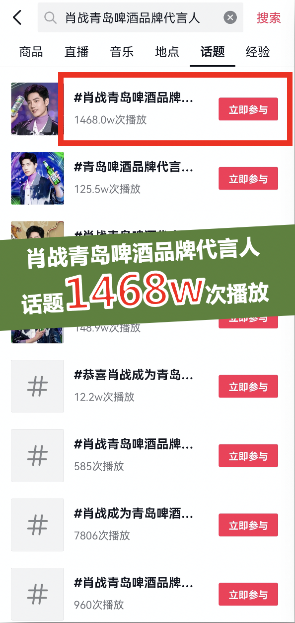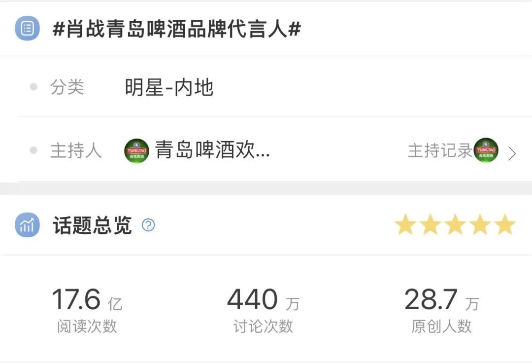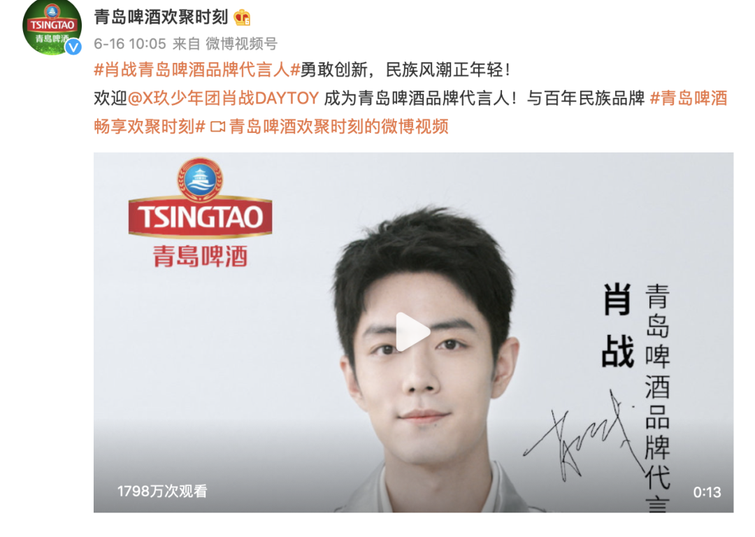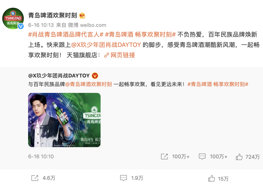 从预热到官宣,品牌热度极速飙升,仅微博平台#肖战青岛啤酒品牌代言人#和#青岛啤酒,畅享欢聚时时刻#双话题阅读量就突破了30亿次,官宣日系列微博合计互动量超1200万,成功在多线渠道引爆热议。