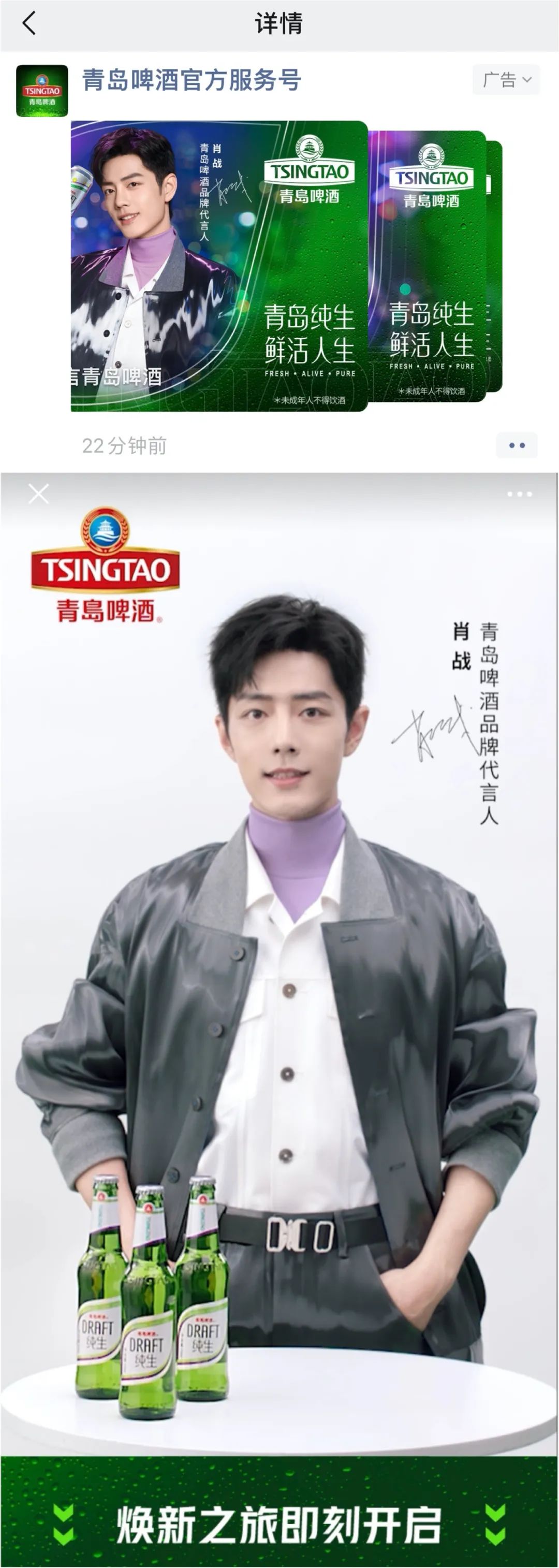 这个夏天,青岛纯生焕新升级,携超鲜实力派肖战鲜活霸屏,邀约举杯畅享欢聚时刻,用新鲜营销力,抢跑品牌年轻化赛道!