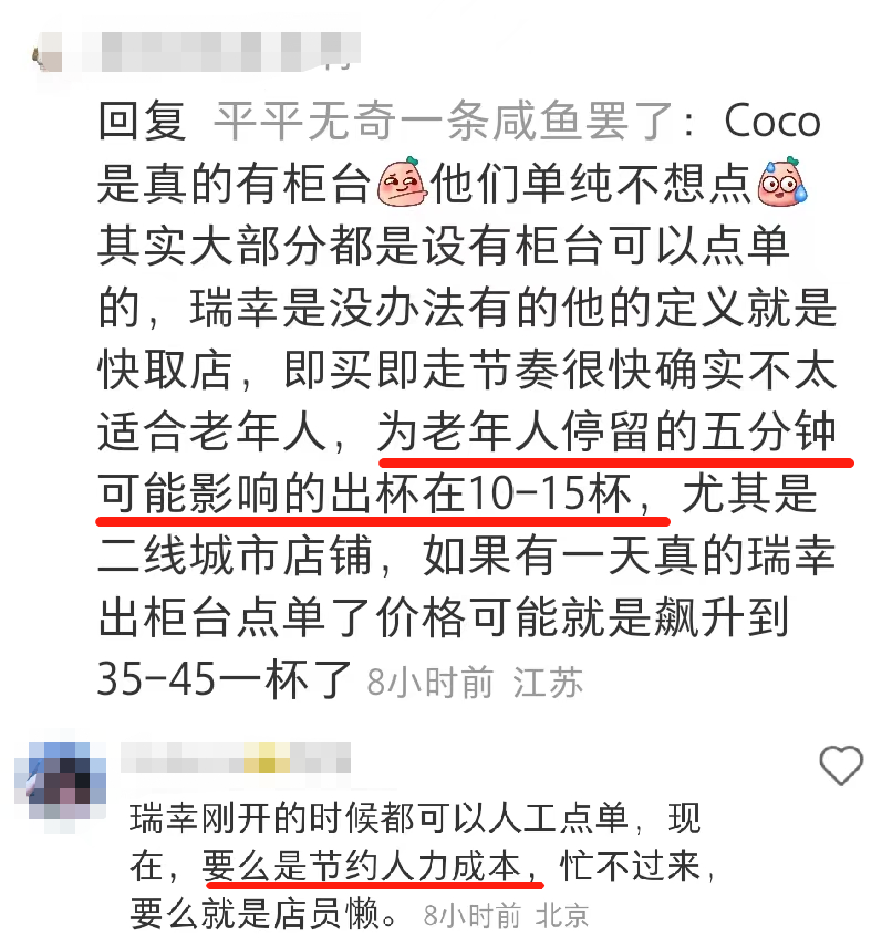 对于不会手机操作下单的,瑞幸店员不是没辙。自称瑞幸上班的,说柜台可以点单,得让店员用自己手机点,缺点是得按原价买。要知道如果按照原价买,一杯咖啡要20-30元,这价格可以说跟星巴克不相上下了。除了老年客群,不乏有其它网友点瑞幸,因为只能手机下单被劝退。