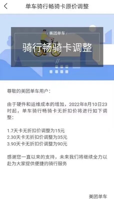 8月10日,美团单车宣布,骑行畅骑卡7天、30天和90天不限次卡的价格,分别从10元、25元、60元上调至15元、35元和90元,涨幅高达40%~50%。其他品牌的共享单车起步价也几乎都做出调整,价格涨幅均在50%左右。