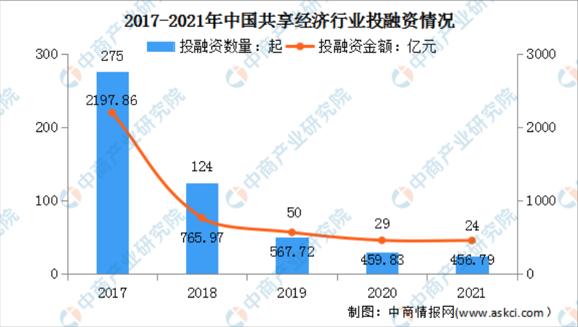 2017年我国共享经济行业投融资数量高达275起,投融资金额达到2197.86亿元。2018年开始投融资数量和金额均出现下降趋势,到了2021年,我国共享经济行业投融资数量仅为24起,投融资金额也缩减至456.79亿元。资本正在加速退场。