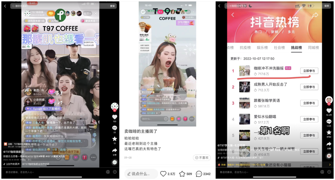 第三,善于打造能在社交平台"疯传"的内容点。比如一篇主题为《卖咖啡的主播困了》的图文在小红书获得了2.2万点赞,利用反差非常容易创造笑点、槽点,从而出圈。在抖音平台发布的“咖啡冲不冲洗脑摇”合拍,更是在10月7日登上挑战榜第一名,其内容便是大嘴妹平常的直播话术合拍。