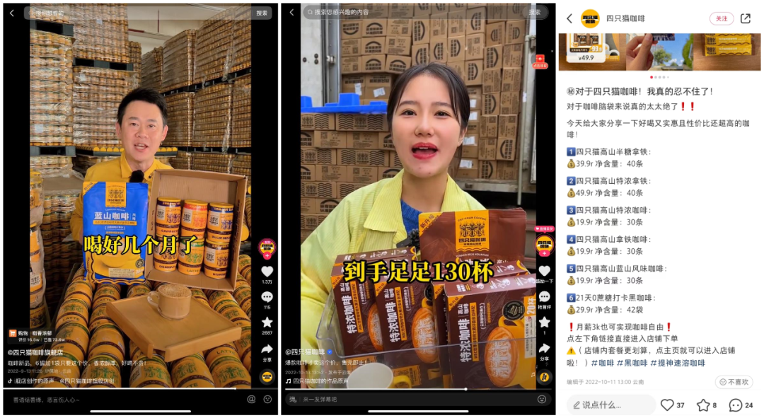 另一家也是2014年成立的咖啡品牌则走了一条截然不同的路——四只猫咖啡(原名“肆只猫”)是云南大学生创业孵化项目,是线上全渠道速溶咖啡自营品牌,其主营产品是三合一速溶咖啡。2022年第一季度,四只猫咖啡占抖音速溶咖啡品类GMV贡献55%以上,自播业绩同比增长近10倍。