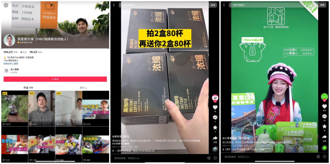 “性价比”是它们最重要的特征。主播形象朴实、不依赖某一角色,话术特点简单明确。抖音、快手、小红书运营风格统一,主打低价速溶咖啡产品。会用视频、文字直观体现买一送多,内容多为“一罐的价钱买130杯”。