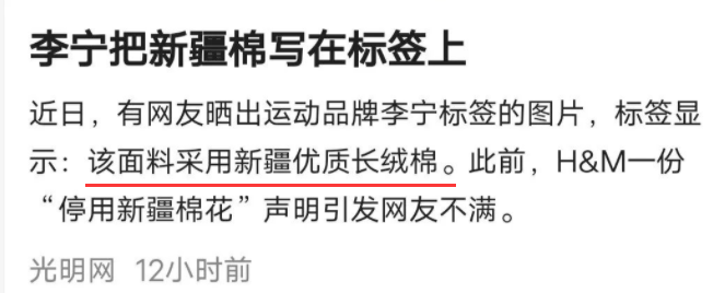 且不讨论李宁的系列翻车,回顾李宁过去这几年,不得不说这个品牌确实掌握了“中国”的流量密码,吃了一波爱国红利。2018年的时候,李宁带上“中国李宁”登上纽约时装周秀场,气场碾压国际一线奢侈品牌,可以说给国货长脸,打了场时尚翻身仗。去年3月新疆棉事件爆发后,网友把耐克、阿迪达斯、HM等国际品牌拉黑,开始野性消费国货。当时网友扒到李宁产品使用的新疆棉,记者探店也发现李宁商品标签会注明“新疆棉纱线”。
