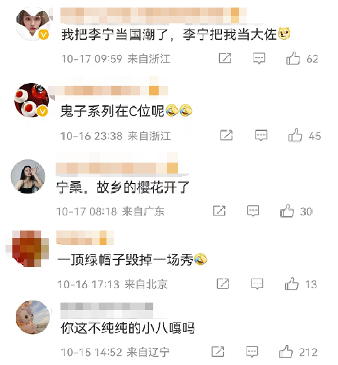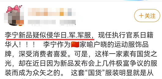 在新疆棉事件中,在同行的衬托下,李宁可谓赚了一波路人缘。但现在结合最近的事情来看,李宁的爱国营销,显然玩砸了。爱国营销没有错,还是希望李宁要好好珍惜自己的羽毛。说到底,日本元素是国人敏感的话题,品牌一旦处理不好就容易惹众怒。前有农夫山泉宣传“拂晓白桃产自日本福岛县”,伏见桃山名字被喷,名创优品挂日本旗、禁播中文歌。这些品牌无一例外都冒犯了中国消费者,差点被骂到退网,它们也印证了一个道理,“吃中国饭,砸中国锅”的骚操作,终究会被中国消费者抛弃。“李宁=国货”,可能是今年最好笑的笑话了。