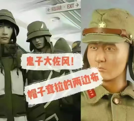 军绿色配色就算了,关键是这双耳帽垂设计,跟小鬼子的屁帘帽设计如出一辙。