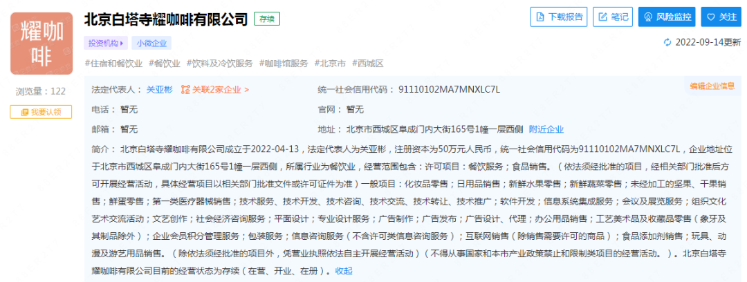 据企查查显示,北京白塔寺耀咖啡有限公司成立于今年4月,由北京白塔寺药店连锁公司持股51%,经营许可范围包括餐饮服务、食品销售等。
