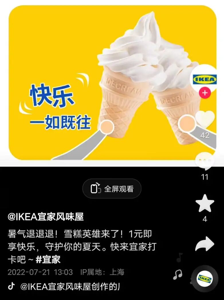 在当时,因为“雪糕刺客”的话题,在各大媒体上舆论风波不断。而宜家风味屋所发布的第一个视频就是其线下门店当中的1元冰激凌,并且把自己营销成了“雪糕英雄”,狠狠蹭了一波热度。