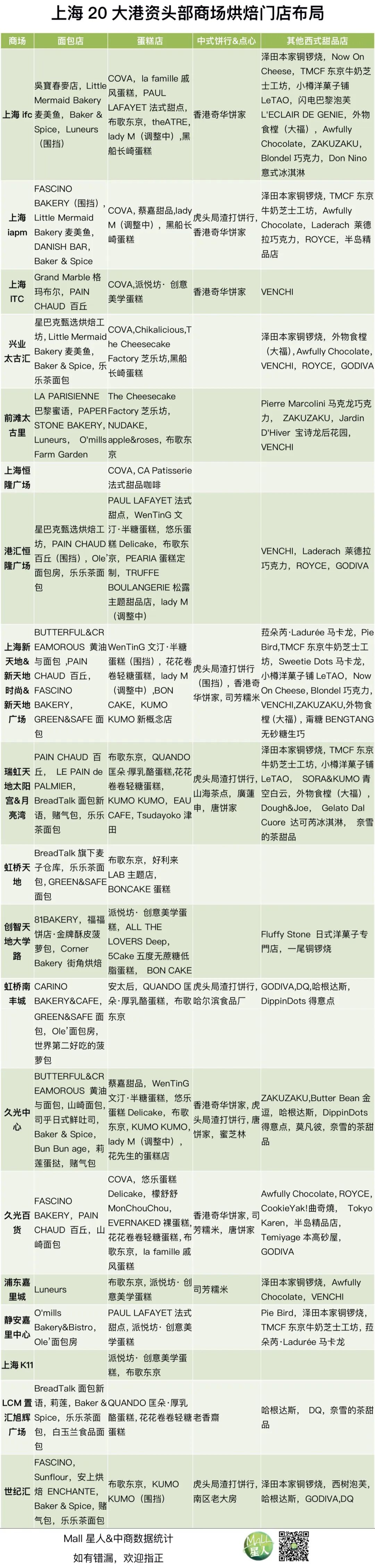 中式糕点方面,广莲申、虎头局、泸溪河、伶小熙、珍糕兴、詹记桃酥是展店最迅猛的品牌(具体新店请看下表),但港资购物中心仅能看到虎头局和香港奇华饼家。