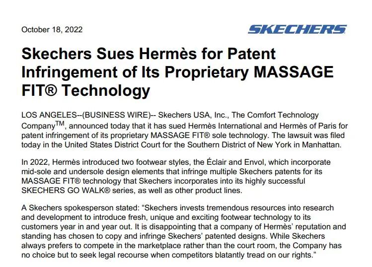 具体来看,斯凯奇(Skechers)在官网发布声明称,向美国地方法院起诉爱马仕国际(Hermès International)与法国爱马仕公司(Hermès of Paris,Inc.)侵犯其鞋底设计专利权。