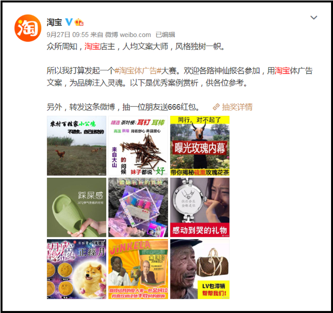 毕竟淘宝的设计,向来走的都是“土丑”风,就连品牌都会常常以此来调侃自己。之前发布了#淘宝体广告#活动,土味文案带观众来了一波回忆杀。