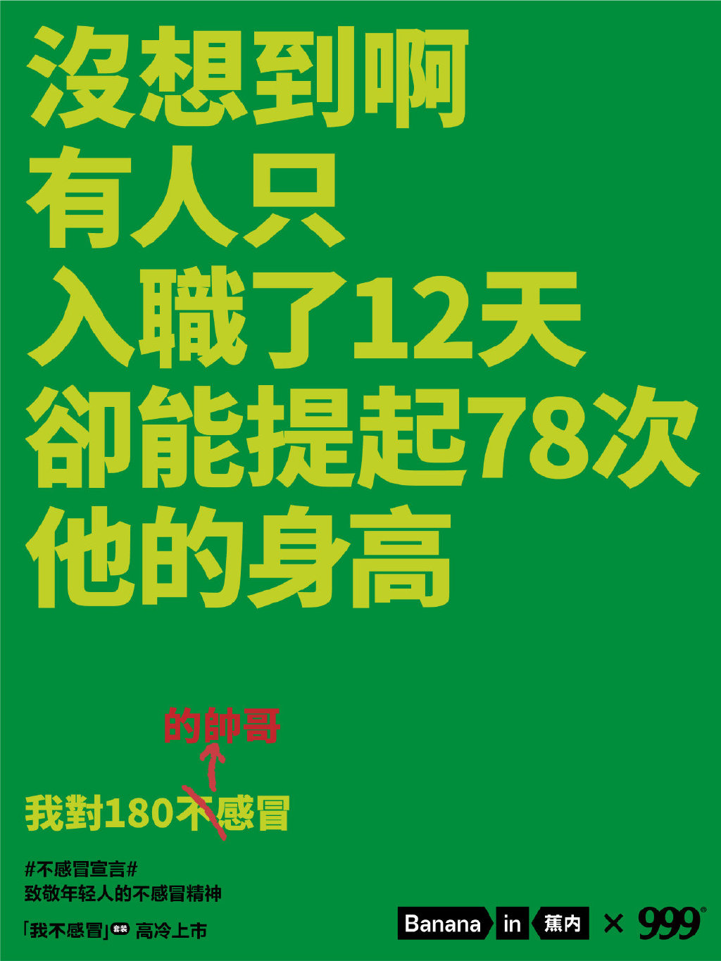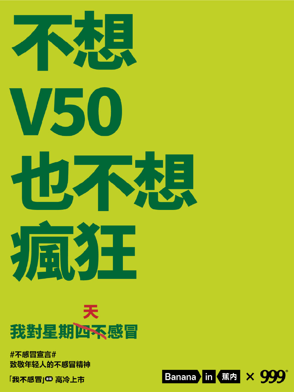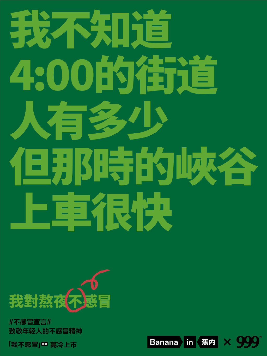 蕉内x999感冒灵的「不感冒」精神,一方面致敬年轻人独立独行,勇敢说不的勇气;另一方面,旨在传达有蕉内热皮和999感冒灵的守护,在保暖御寒的内衣和预防感冒的药品的双重攻势下,即使秋冬寒冷季节,也不会感冒。