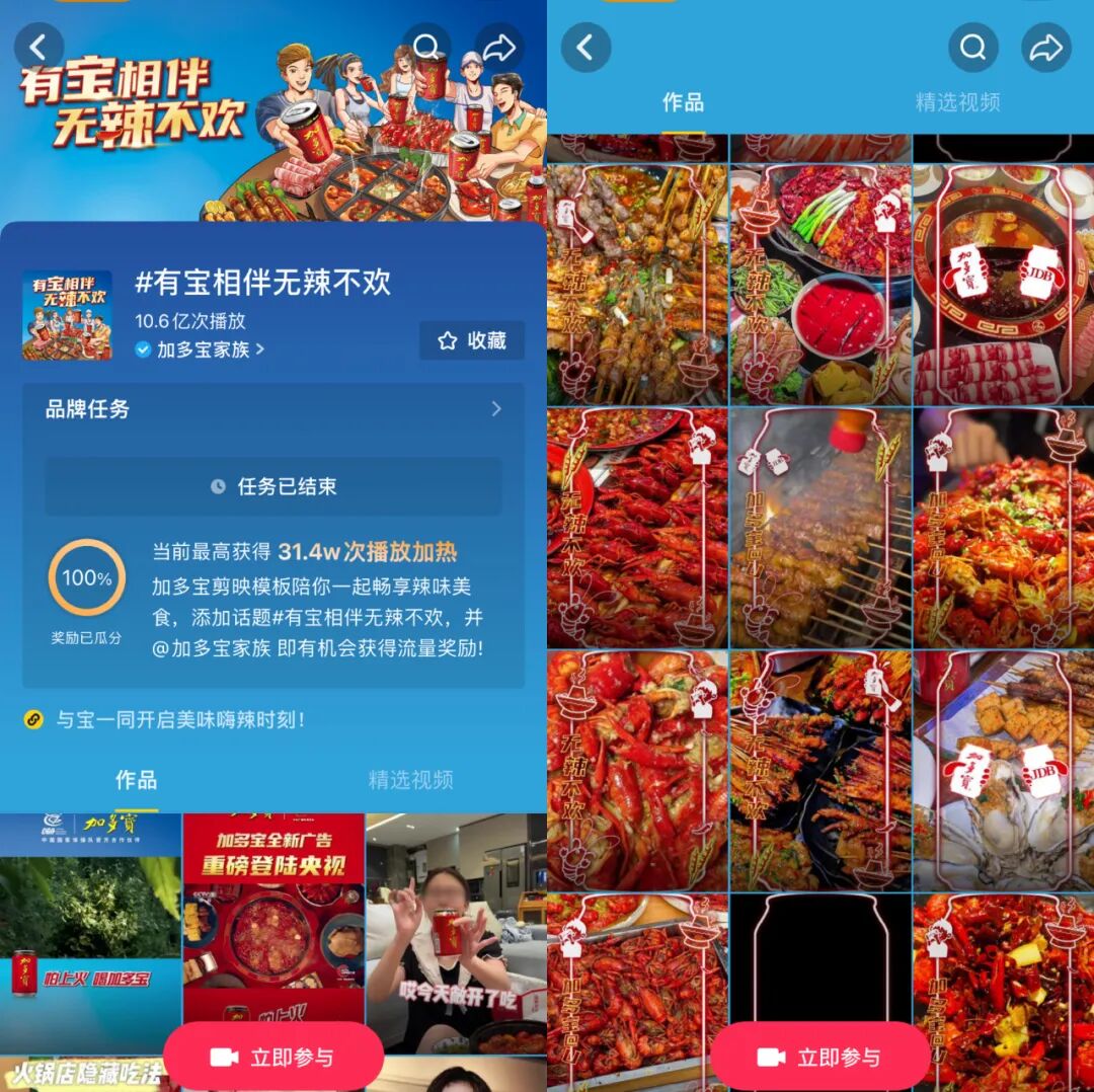 在抖音,加多宝重磅上线了“有宝相伴 无辣不欢”挑战赛,希望借助年轻人的社交分享玩法激活吃货们的UGC创意能量,而放眼望去确实千篇一律的火锅、烧烤、小龙虾,但实际上,引领潮流的年轻人早已对这些不那么感兴趣了。