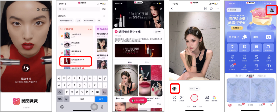 此次动中,美图不仅在站内发布活动,引导用户参与,分享自己的使用体验,完成端内种草。同时,还引导用户分享到站外小红书等社交平台,让纪梵希新品在多个社交平台全面引爆热度。