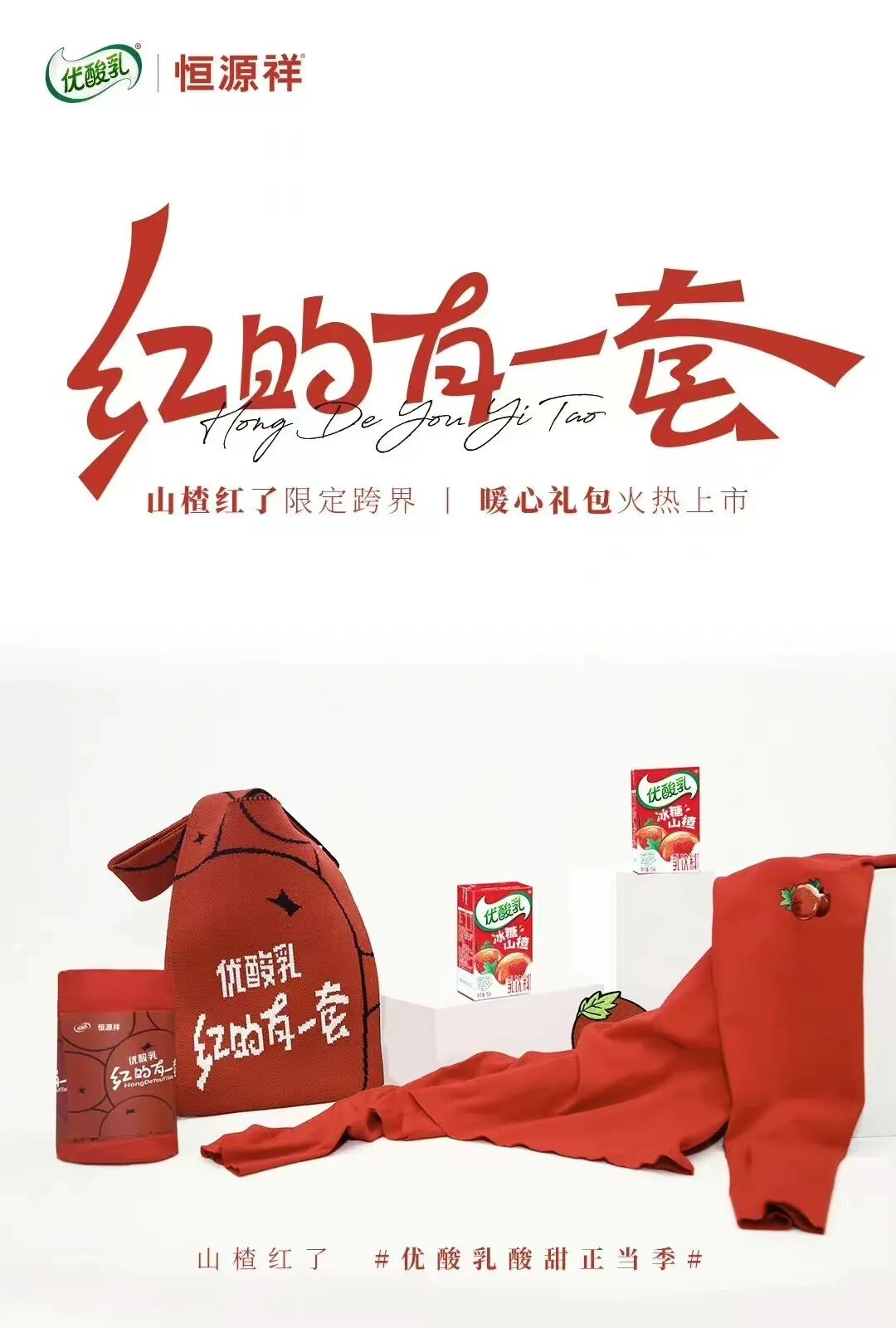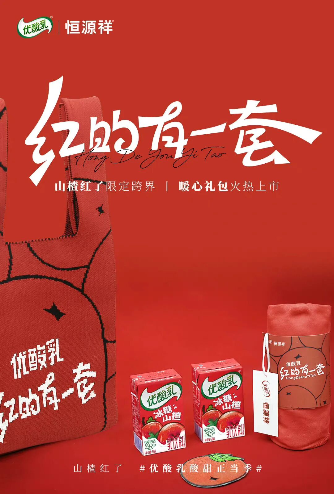洞察到社交平台上日益浓郁的山楂红潮流气息,消费者对秋冬记忆里山楂酸甜滋味的怀念,以及天气变化带来的低迷情绪,优酸乳选择携手同样有着温暖属性的国民老字号恒源祥,重新定义“山楂红”,红是秋冬主流色,红是酸甜山楂滋味,更能为好运加buff,并以“山楂红事事红”的美好寓意为出发点,联名打造了限定款#红的有一套#山楂红秋衣裤礼包,跨界幅度之大着实让人直呼内行。礼包内含当季饮品优酸乳冰糖山楂2盒,优酸乳X恒源祥山楂红限定款保暖套装1套,红山楂魔术贴1个,限定线织手腕包1个,一套山楂红组合暖身又暖心,自带满满红运。