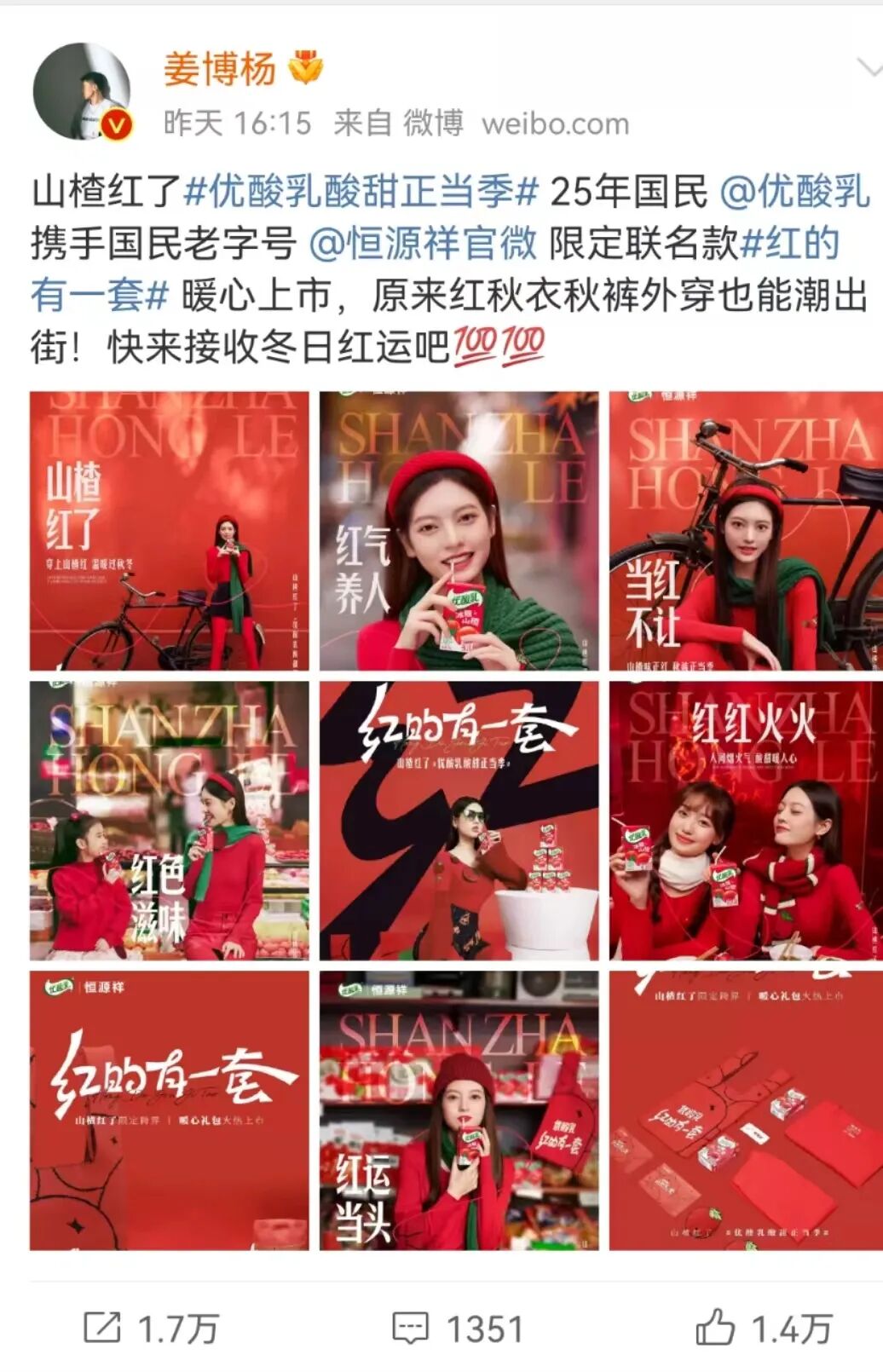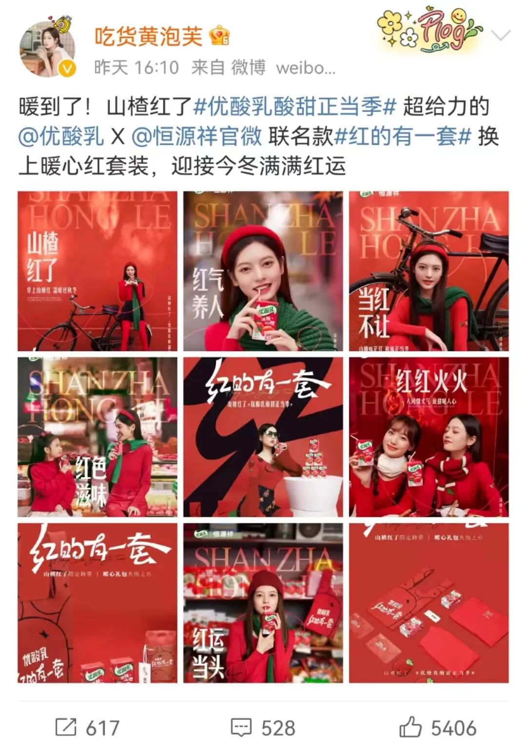 从结果来看,此次优酸乳携手恒源祥的跨界无疑是成功的。以“红的有一套”为主题,优酸乳将自身的新品属性与社会环境、消费者心理相结合,通过设计联名礼包、打造线上创意营销活动,撬动了时尚圈优质、年轻的粉丝资源,同时渗透到了大众圈层,不仅让新品“优酸乳酸甜正当季”获得了更大曝光,也为品牌注入了更多新鲜感和年轻感,沉淀了更多消费者好感和认同,为其他品牌年轻化提供了参考和更多可能。