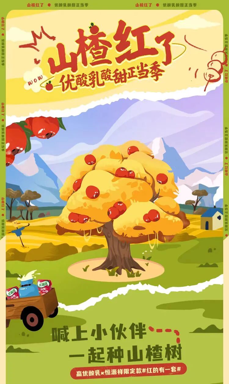今年10月,畅销25年的国民品牌优酸乳就以今年新品冰糖山楂为主推品,以山楂红了#优酸乳酸甜正当季#为季度主题,携手恒源祥联名打造了#红的有一套#山楂红秋衣裤礼包,并通过发布主题时尚大片、线上秋衣裤走秀、小程序种树等一系列传播动作,成功开启了一场有关山楂「红」的跨界营销,不仅好喝好穿而且好玩,属实“跨”出了一波新意。