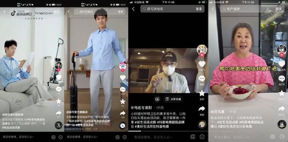在新品种草期,添可联合抖音电商超级品牌日打造了超级达人种草团,为全系产品构建多元化内容生态,通过不同类型和风格的种草达人内容,还原出养宠人士&精致妈妈&都市青年等目标人群的家务痛点场景,全方位展现产品性能和卖点,进行强种草操作,触达不同目标人群,有效提升产品刚需值,影响力破圈。