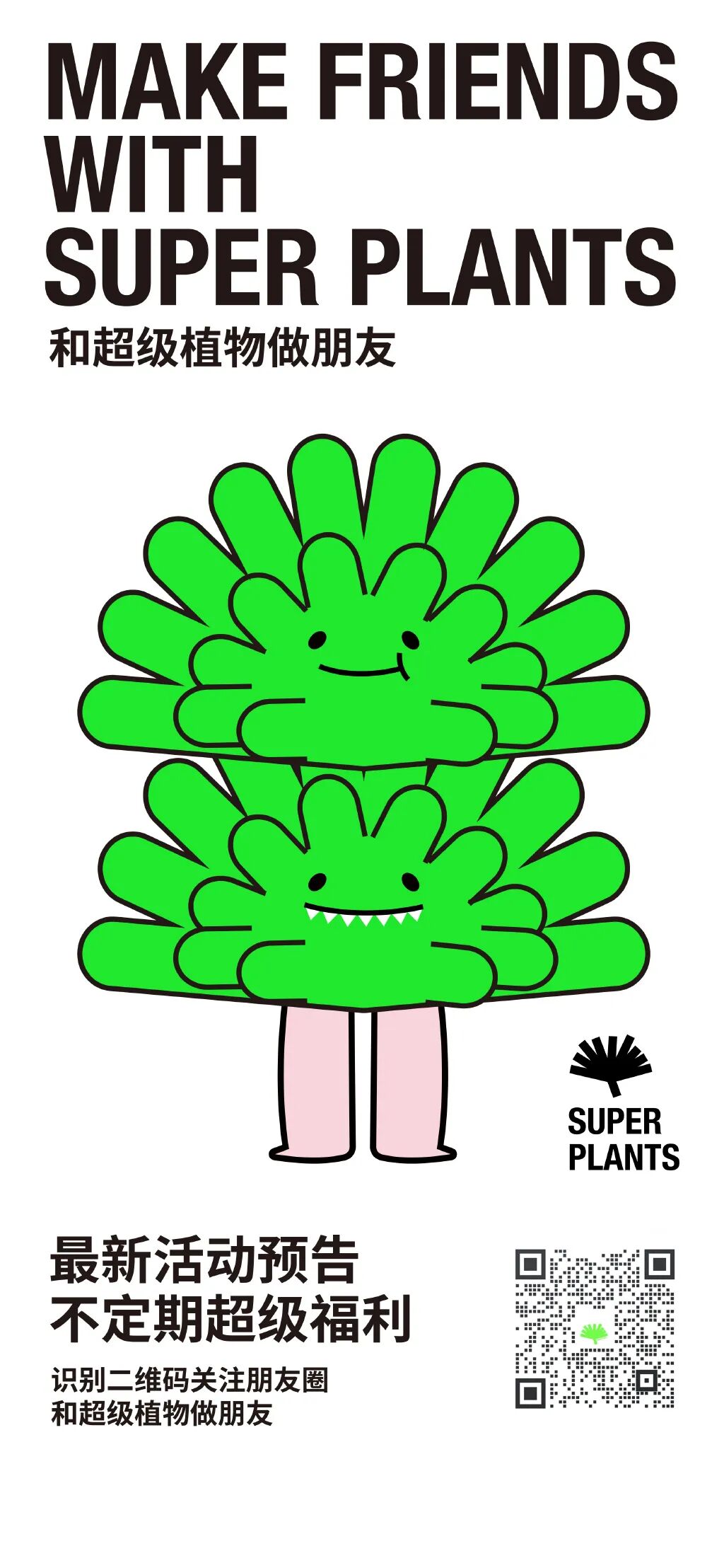 有这么一家卖“假”花“假”草的公司——超级植物公司。正在用一种很新的方式做海报宣传,鲜艳的底色、略显“稚嫩”的图形,大大的文字,没有过载的信息,用最直接的视觉感官冲击,设计感、幽默感兼具,这就是年轻人的种草方式。