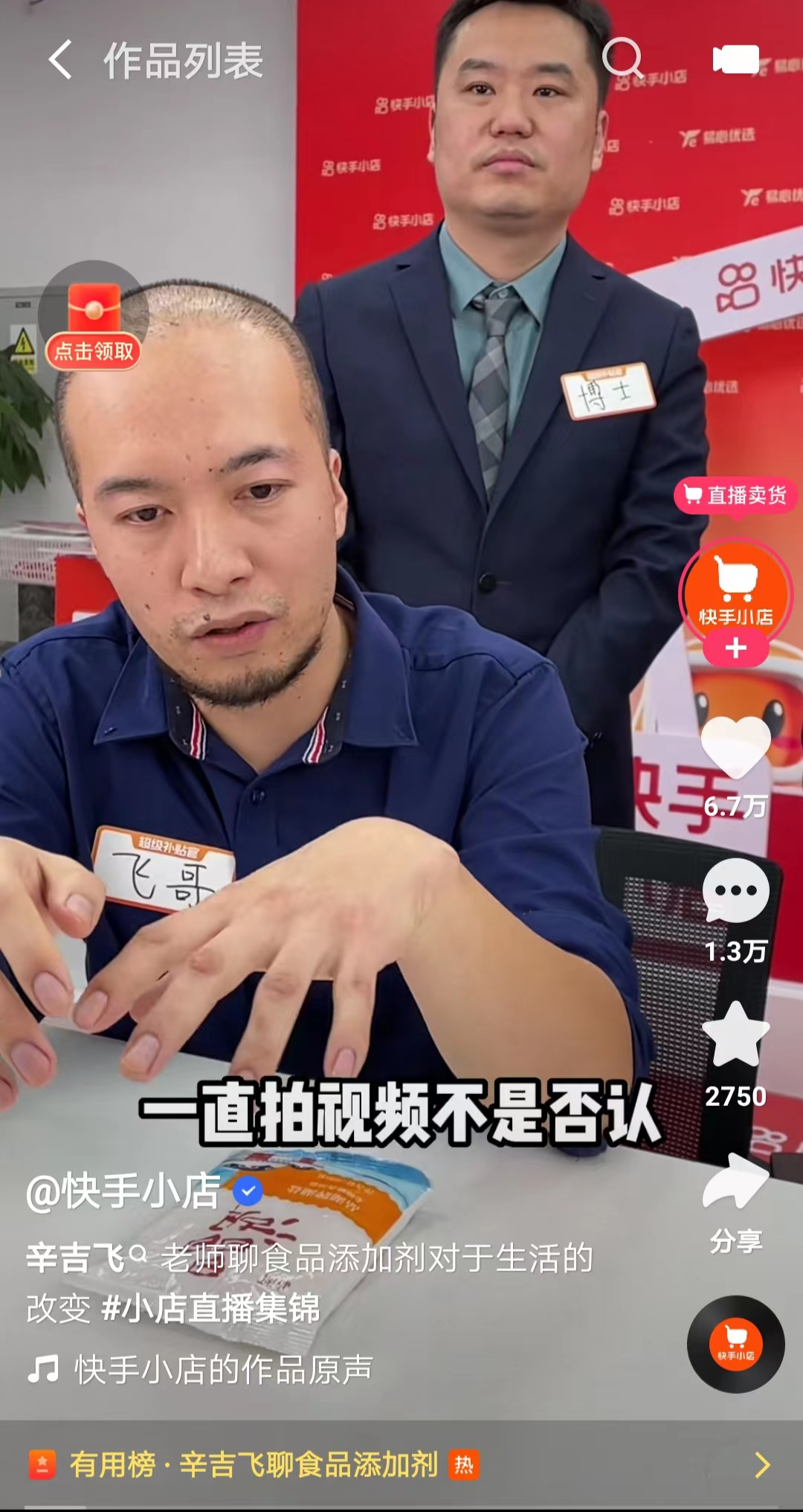 在当晚的直播中,辛吉飞确实只担任科普产品成分的角色。在介绍晶湖牌食盐时,他教用户如何区分加抗结剂的盐和不加抗结剂的盐;对于红枣,他表示,一般脆枣都是油炸的,不太适合经常食用,而且油炸所用的油也含科技成分;关于方便面,他直言方便面面饼、酱料包里有很多添加剂,可以用来解燃眉之急,但不要把方便面当正餐吃。同时,辛吉飞在直播间还首度回应了其“海克斯科技”短视频引发的对食品添加剂的争议。他表示,“一直拍视频不是否认、以偏概全、完全妖魔化这个食品添加剂。我是讲现在的食品添加剂不是为了更好的提高食品的品质,然后也不是延缓它的保质期,是用它以次充好。例如一些合成牛排,或者是一些牛羊肉卷,或者调制的饮料牛奶。我是这个意思啊!”