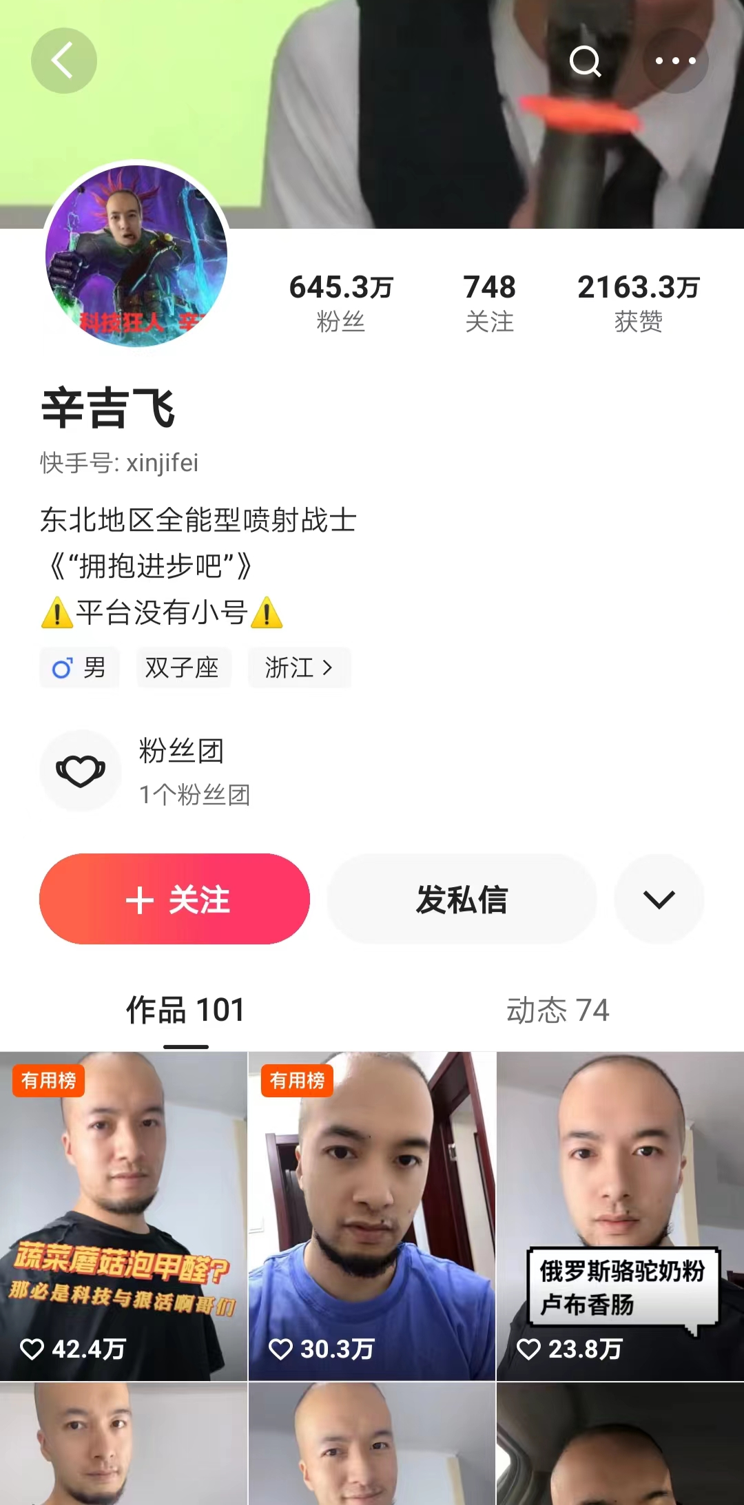 从今年8月,凭借揭秘“海克斯科技”,20天抖音涨粉450万,到9月28日,已经900万粉丝的抖音账号被注销,再到10月26日在快手直播,辛吉飞的网红之路走得跌宕起伏。如果说注销抖音账号,是辛吉飞的“一时意气”,那么选择到快手直播,足见对于成为网红,辛吉飞已经有了一个更成熟的思路。有消息称,此次直播,是辛吉飞主动联络的快手官方。从抖音转战快手,辛吉飞的热度只增不减。如今,辛吉飞在快手拥有645.3万粉丝,发布作品101个,获赞就达到了2163.3万。