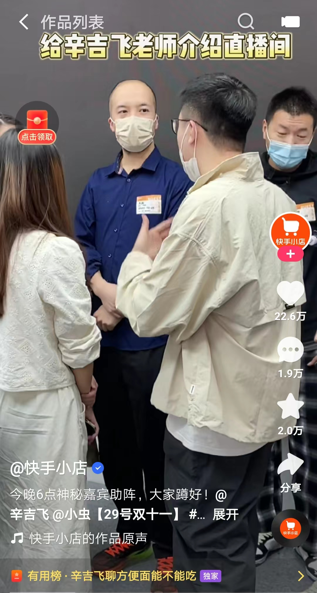 淘宝挖到了罗永浩,快手迎来了辛吉飞。双十一前夕的这波电商厮杀,变得越来越热闹。10月26日,快手小店发布了一支短视频,展示了工作人员向辛吉飞介绍直播间、讨论选品、认真讲解、讨论产品细节、沟通产品机制、一起拍摄短视频等内容,正式预告辛吉飞将于晚上6点担任直播间嘉宾的消息。