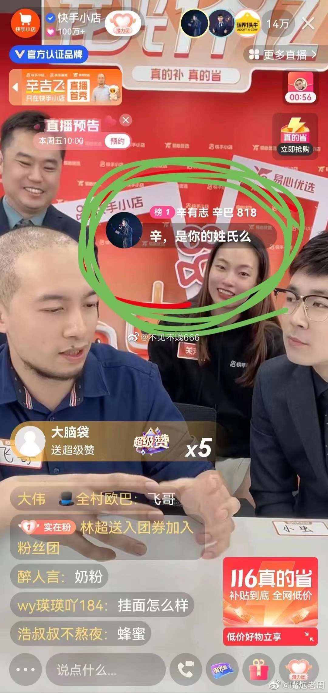 辛吉飞参与的这场直播,引发了不小关注。整场下来,点赞量高达100万+,观看人数破16万。有意思的是,“快手一哥”辛巴也赶来凑热闹,实现了“双辛”联动。辛巴不仅在直播间攀亲戚,问辛吉飞“辛,是你的姓氏么”,更是刷了近30万贡献值,当上了“榜一大哥”。