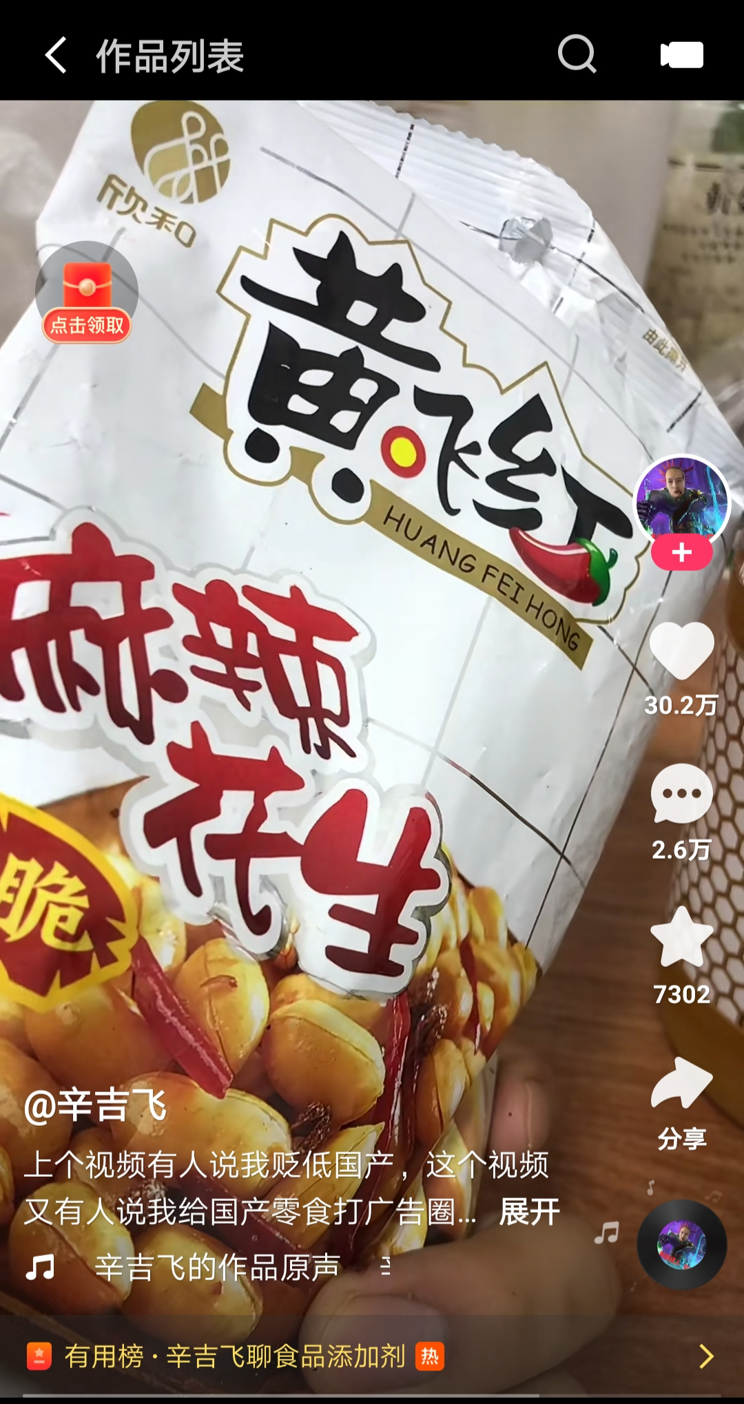 在一支短视频中,辛吉飞先是介绍自己买俄罗斯蜂蜜上当的经历,然后拿出了黄飞红麻辣花生,表示“这个小食品挺好吃的”“上次的花生芝麻酱就是用它做的”。
